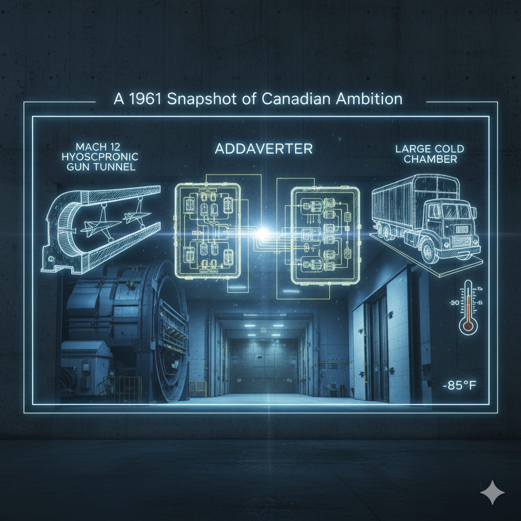 This 1961 document is more than a simple inventory. It is a physical manifestation of Canada’s post-war ambitions. The sheer scale of the investment, from hypersonic tunnels to 450-ft. ship basins, shows a clear understanding that to be a serious industrial nation, you had to build and own the tools to solve your own problems. This was the hardware that would underpin Canadian innovation for decades.