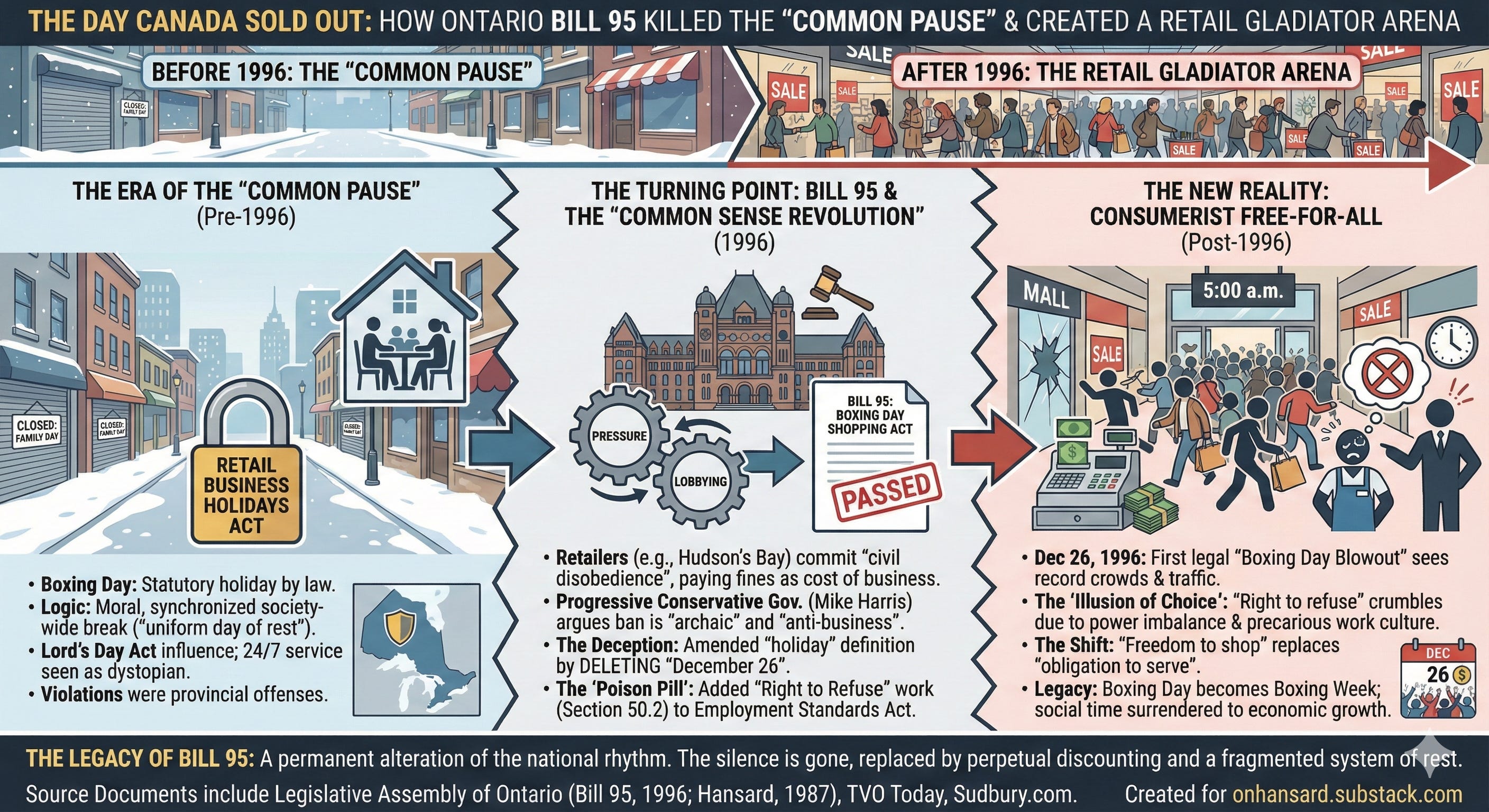 To understand the magnitude of Bill 95, you must first understand the world it destroyed. Through the 1970s and 80s, the Retail Business Holidays Act was the iron gatekeeper of Ontario commerce. It designated specific days, including Boxing Day, as statutory holidays where doing business was a provincial offense.