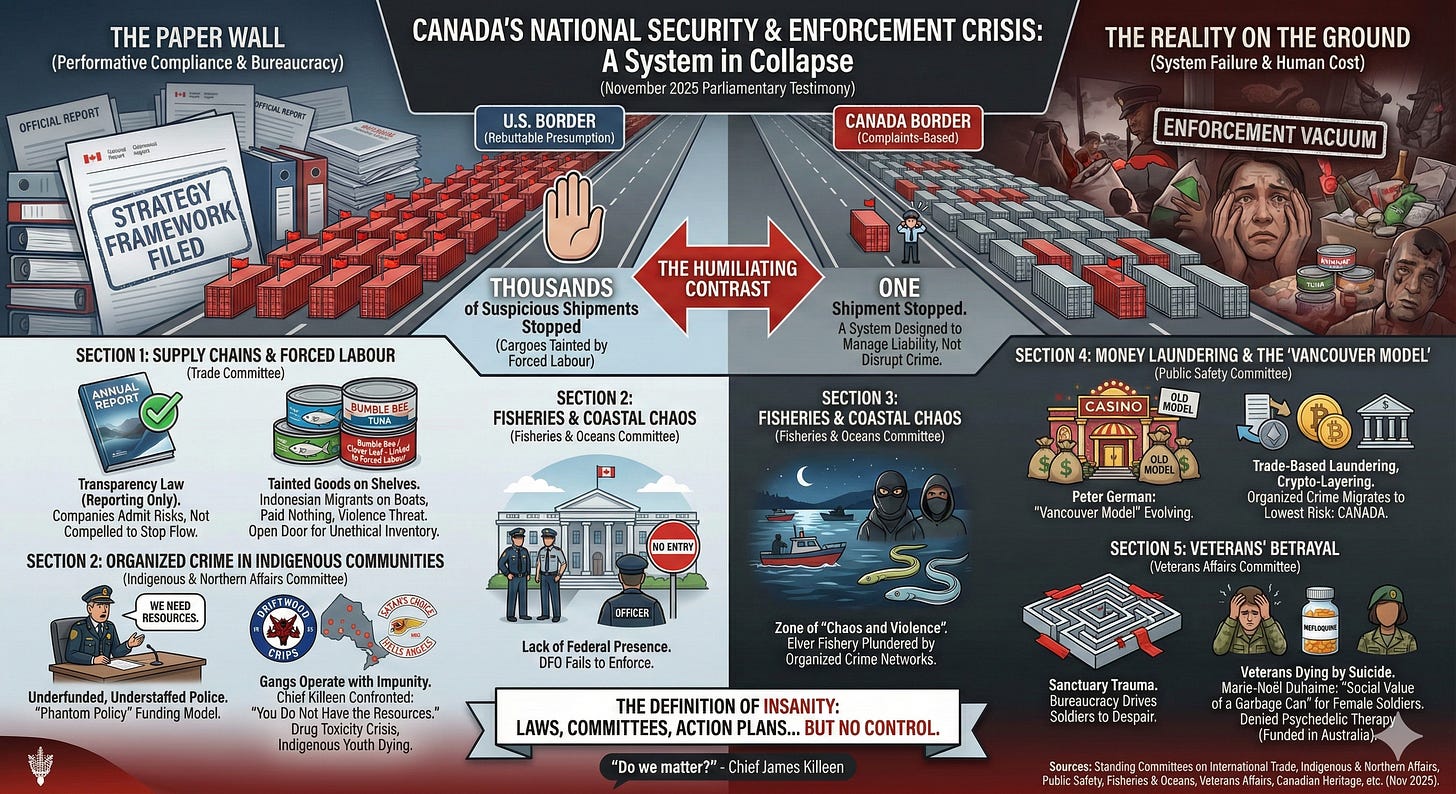 This single, solitary interception is the perfect metaphor for a national crisis that played out across half a dozen committee rooms that week. While the trade committee heard how goods made by enslaved workers flow unimpeded into Canadian ports, the indigenous affairs committee listened to police chiefs describe how the “Driftwood Crips” and “Satan’s Choice” motorcycle gangs have set up unchecked operations in their communities. While public safety officials discussed the “Vancouver Model” of money laundering, veterans testified about a bureaucracy so broken it drives soldiers to suicide.