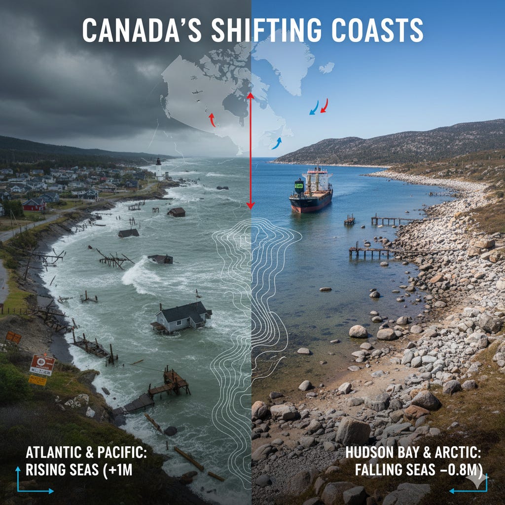 A Divided Outlook: Most of Canada’s Atlantic, Pacific, and Beaufort coasts face rising seas and increased flood risk. In contrast, Hudson Bay and the Arctic face falling sea levels, creating navigation hazards.