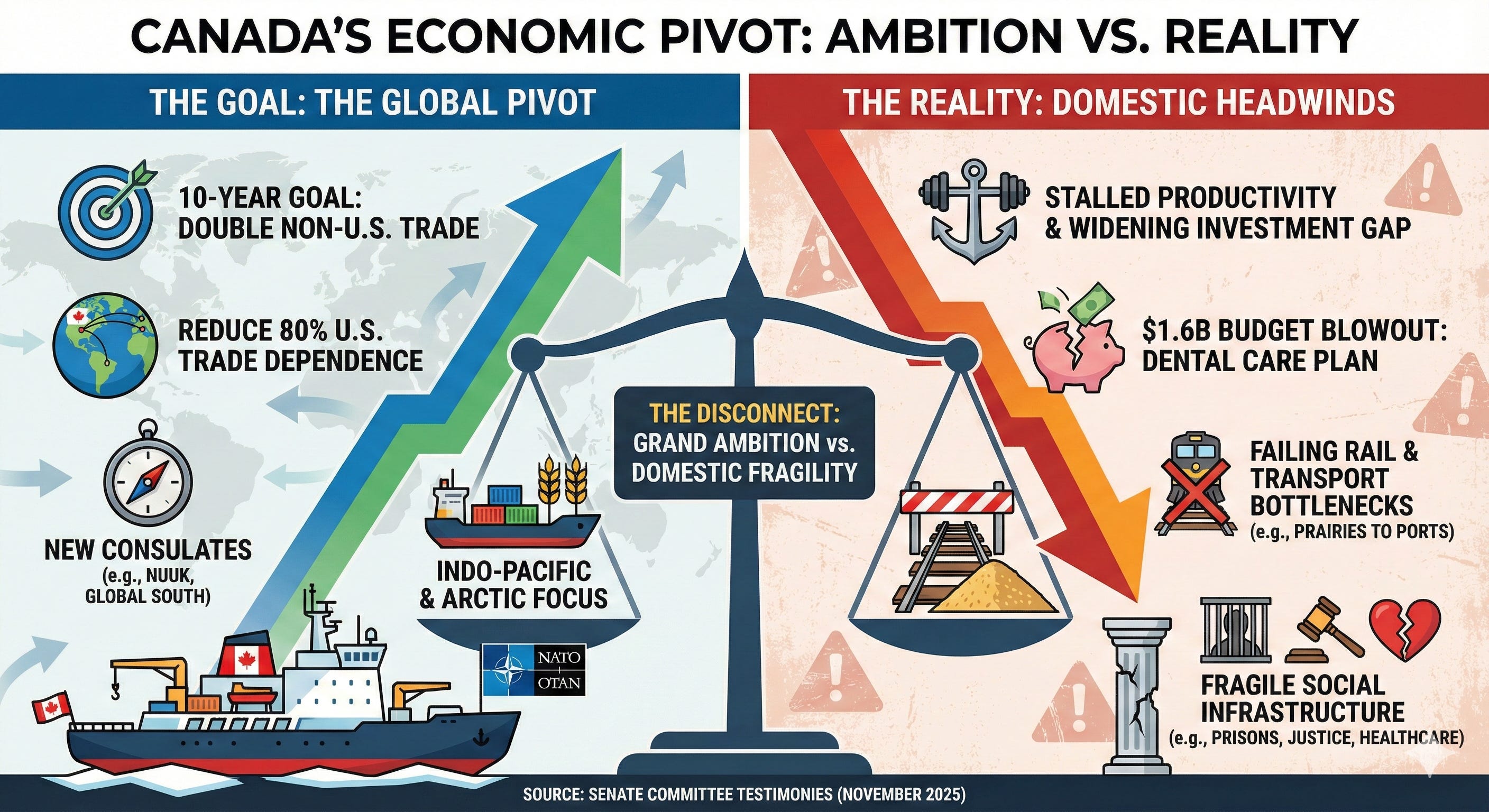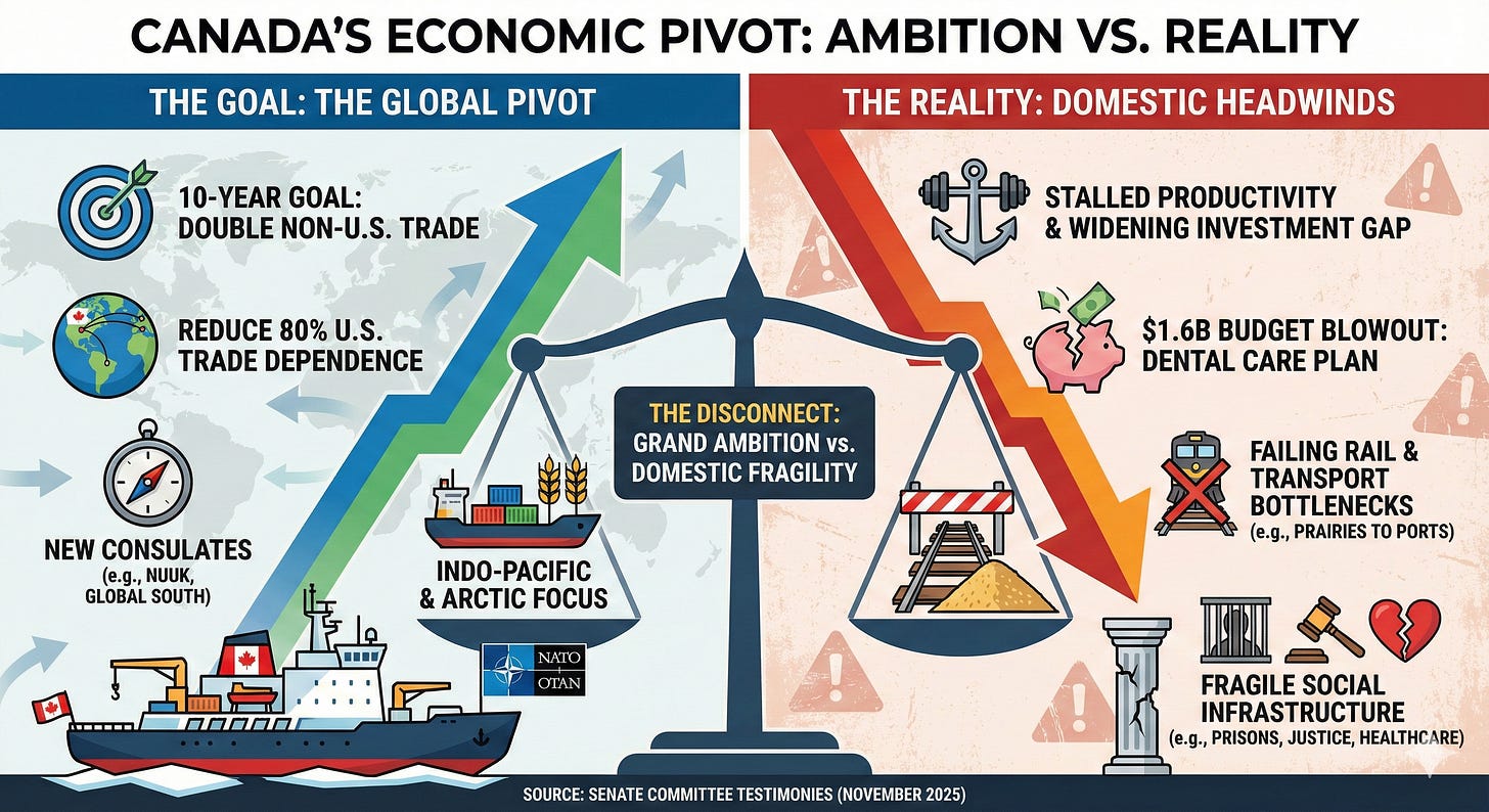 But as Senate committees across Parliament Hill scrutinized the fine print of this grand strategy, a disconnect emerged. While Ottawa looks to the horizon, the domestic machinery required to support such a pivot is flashing red. From a massive $1.6 billion budget blowout in the new dental care plan to a productivity crisis that has business leaders sounding the alarm, the testimony paints a picture of a nation reaching for global economic sovereignty while struggling to keep its own house in order.