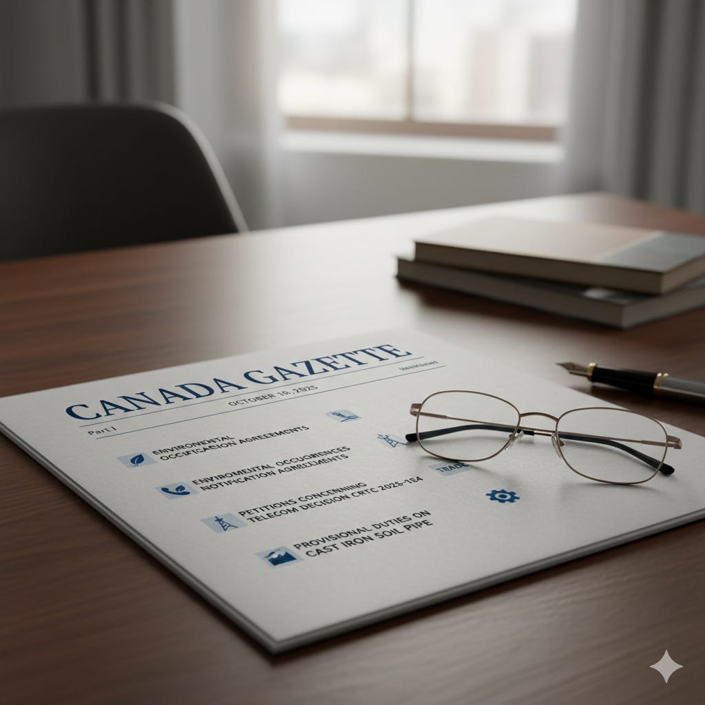 A deep dive into the latest Canada Gazette reveals new federal-provincial environmental pacts, major telecom petitions, and key trade protection decisions.
