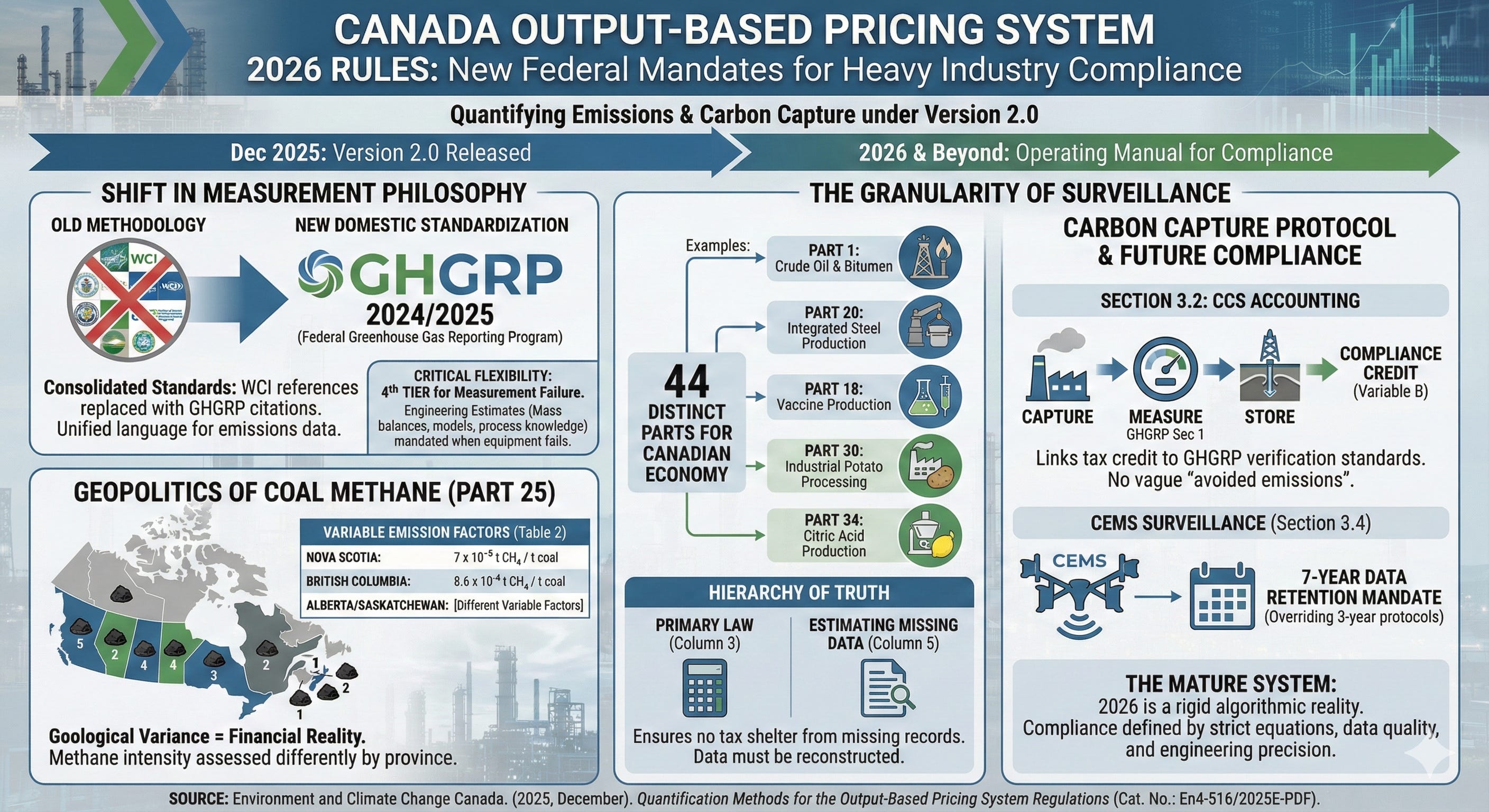 The architecture of Canada’s industrial climate policy is often debated in the House of Commons, but its reality is forged in the quiet release of technical documents. In December 2025, Environment and Climate Change Canada published “Version 2.0” of the Quantification Methods for the Output-Based Pricing System Regulations. This document is not merely a bureaucratic update. It serves as the operating manual for the entire national carbon pricing regime for the 2026 compliance period and beyond. It determines how the Output-Based Pricing System (OBPS) functions on the ground, dictating the precise mathematical formulas that refineries, steel mills, and power plants must use to calculate their financial liabilities to the state.