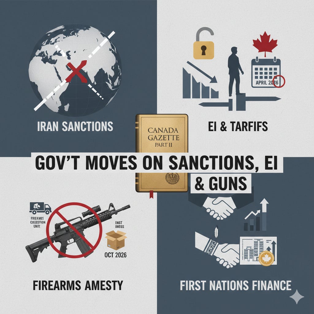 New federal regulations reimpose Iran sanctions, extend tariff-related EI benefits, and adapt rules for firearms, dental care, and First Nations financing.