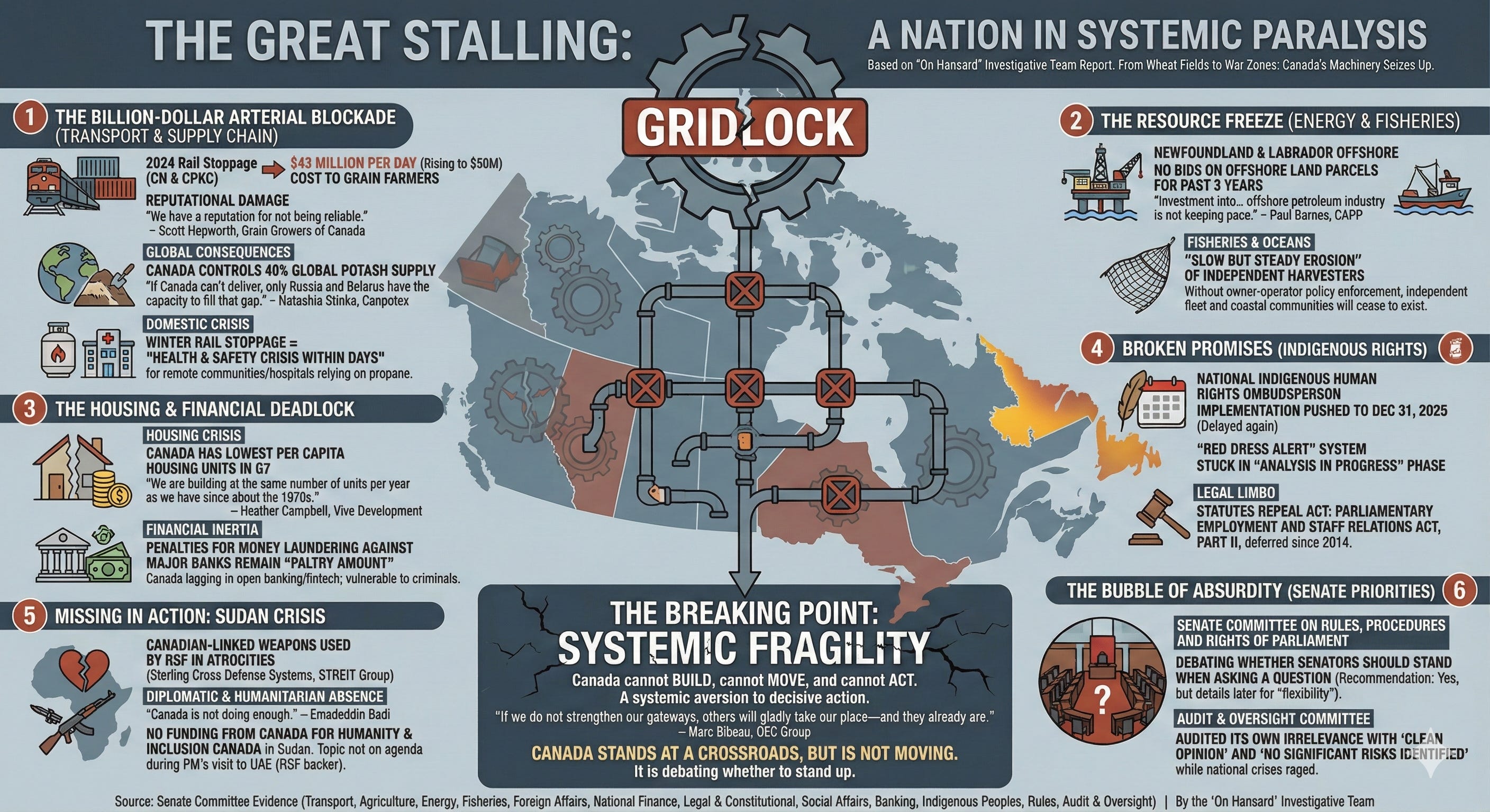 From the wheat fields of Saskatchewan to the war zones of Sudan, a week of Senate testimony reveals a nation in systemic paralysis—unable to move its goods, house its people, or project its values.