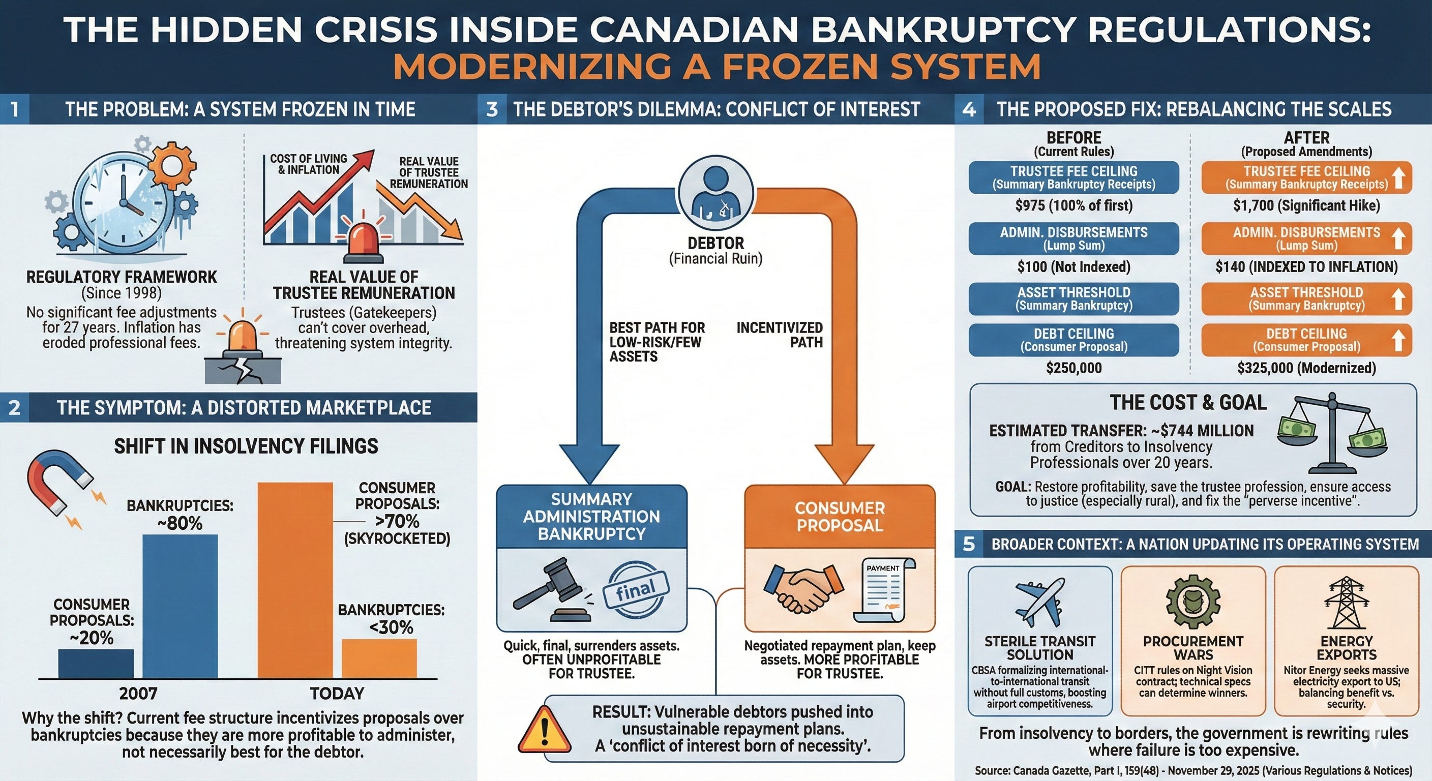 The Canadian insolvency system is quietly suffocating under the weight of its own obsolescence. For over two decades the financial machinery designed to offer a lifeline to drowning debtors has remained frozen in time while the cost of living soared. The result is a distorted marketplace where the path to relief is often dictated not by what is best for the debtor but by what keeps the lights on for the trustee. This Saturday the federal government finally acknowledged the breakage. A sweeping set of proposed amendments to the Bankruptcy and Insolvency Act reveals a system in desperate need of repair where inflation has eroded professional fees to the point that the very people tasked with managing financial ruin are leaving the profession.