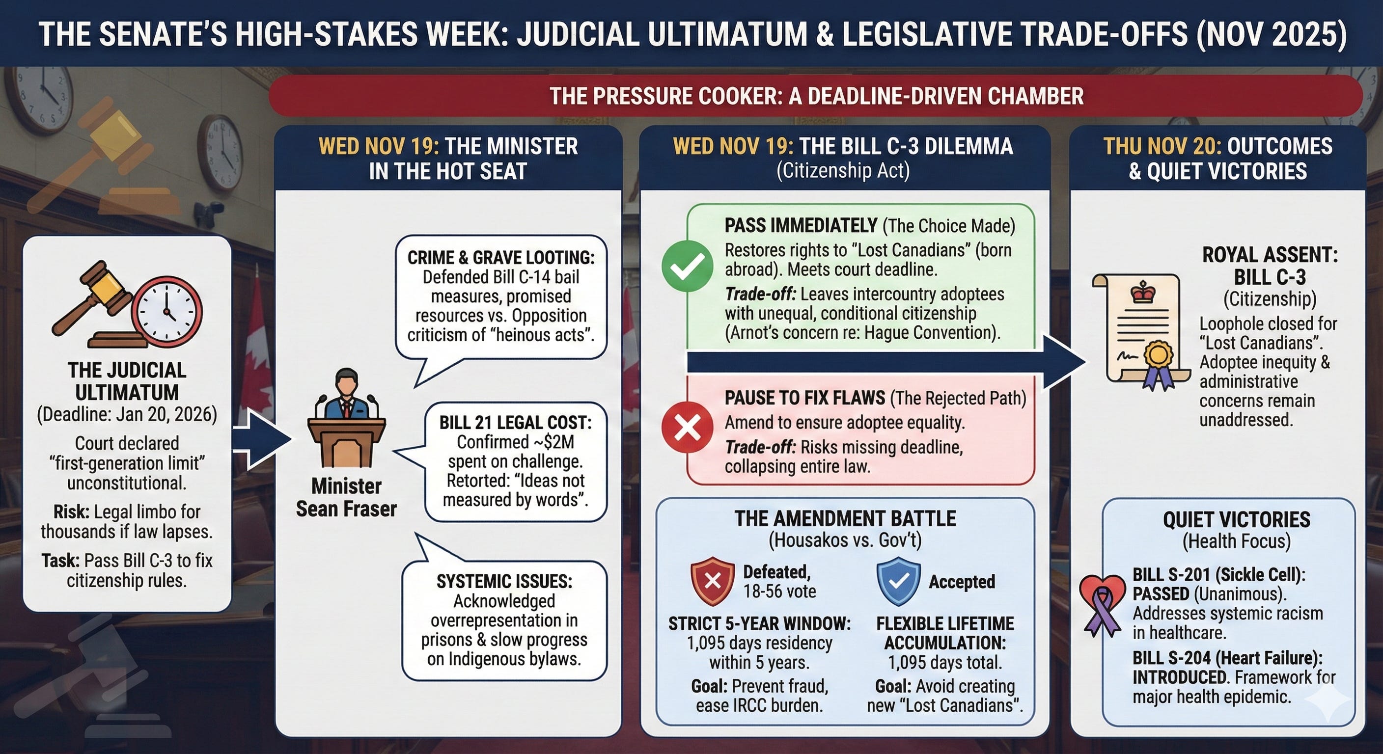The Senate of Canada is often described as a place of sober second thought, a legislative chamber designed to temper the populist impulses of the House with calm deliberation. But during the third week of November 2025, the Red Chamber felt less like a sanctuary of contemplation and more like a trauma unit operating under the flashing lights of a judicial ultimatum.
