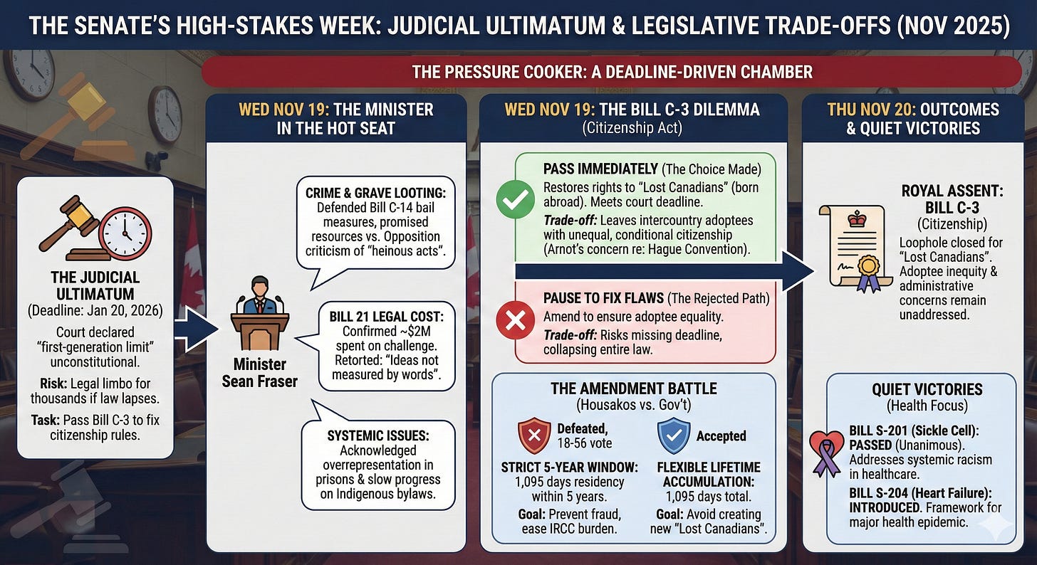 With the clock ticking down to a January 20 extension, the Senate faced a binary choice: pass Bill C-3 immediately to restore rights to “Lost Canadians,” or pause to fix glaring flaws in the legislation that risked discriminating against a new group—intercountry adoptees.