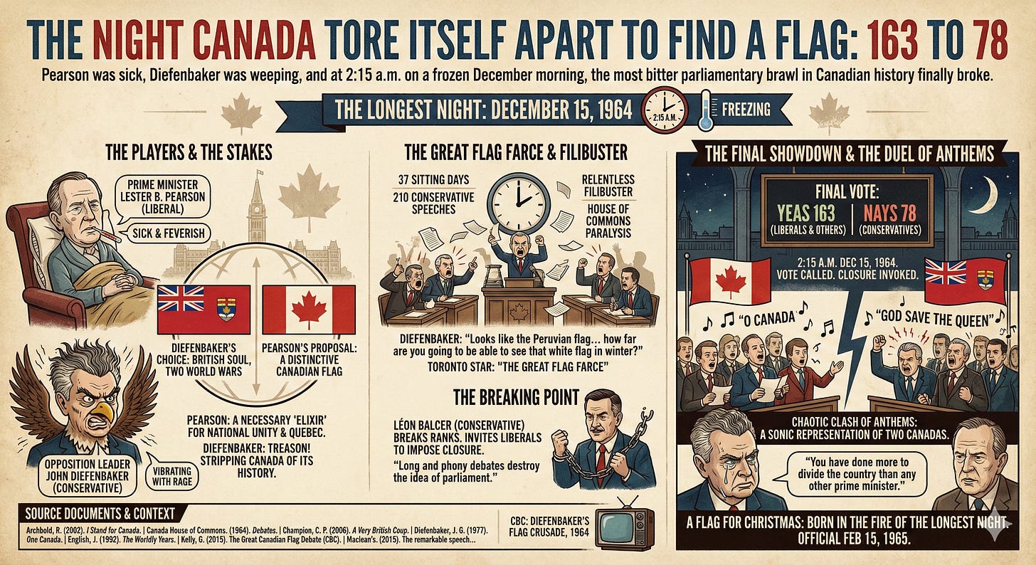 Pearson returned to his sickbed, his “unity” flag won through the most divisive tactic in parliamentary procedure. Diefenbaker went home to mourn the death of the Red Ensign. And the nation, waking up on December 15, finally had a symbol that was entirely, exclusively its own—born not in peace, but in the fire of the longest night.