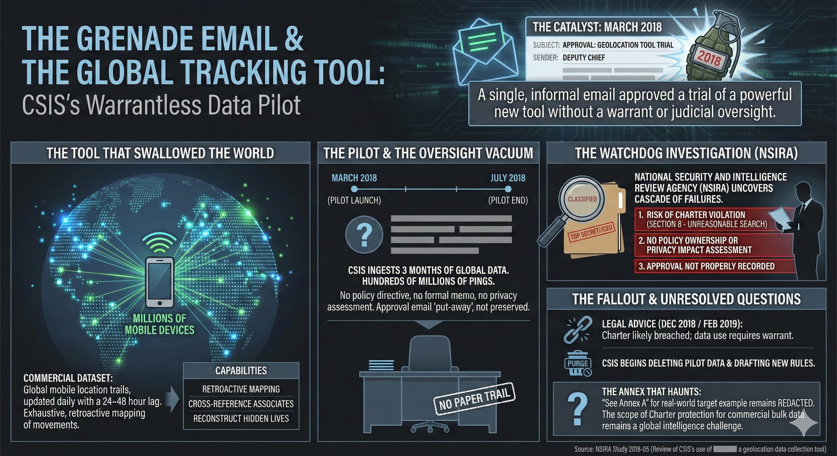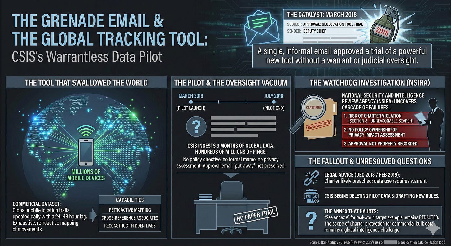 For over a year, the Canadian Security Intelligence Service had been quietly buying and querying what it called a “non-warranted geolocation information collection tool.” The data came commercially, lagged by 24–48 hours, and covered virtually everyone carrying a smartphone. CSIS analysts used it to retroactively map where targets had been, cross-reference associates, and reconstruct hidden lives. All of it done under the banner of “strictly necessary” national security—until the country’s newest intelligence watchdog, the National Security and Intelligence Review Agency (NSIRA), started asking questions.