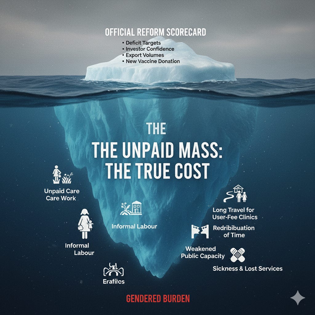 Think of the official reform scorecard as an iceberg. Above the waterline sit the metrics that receive applause: deficit targets, investor confidence, export volumes, a new vaccine donation. Below the waterline sits the mass that keeps the system afloat: unpaid care, informal work, long travel for user-fee clinics, the household redistribution of time when services shift to markets. The Yale discussion paper tells us the underwater mass is gendered. Policy that stares at the tip will miss the collision.