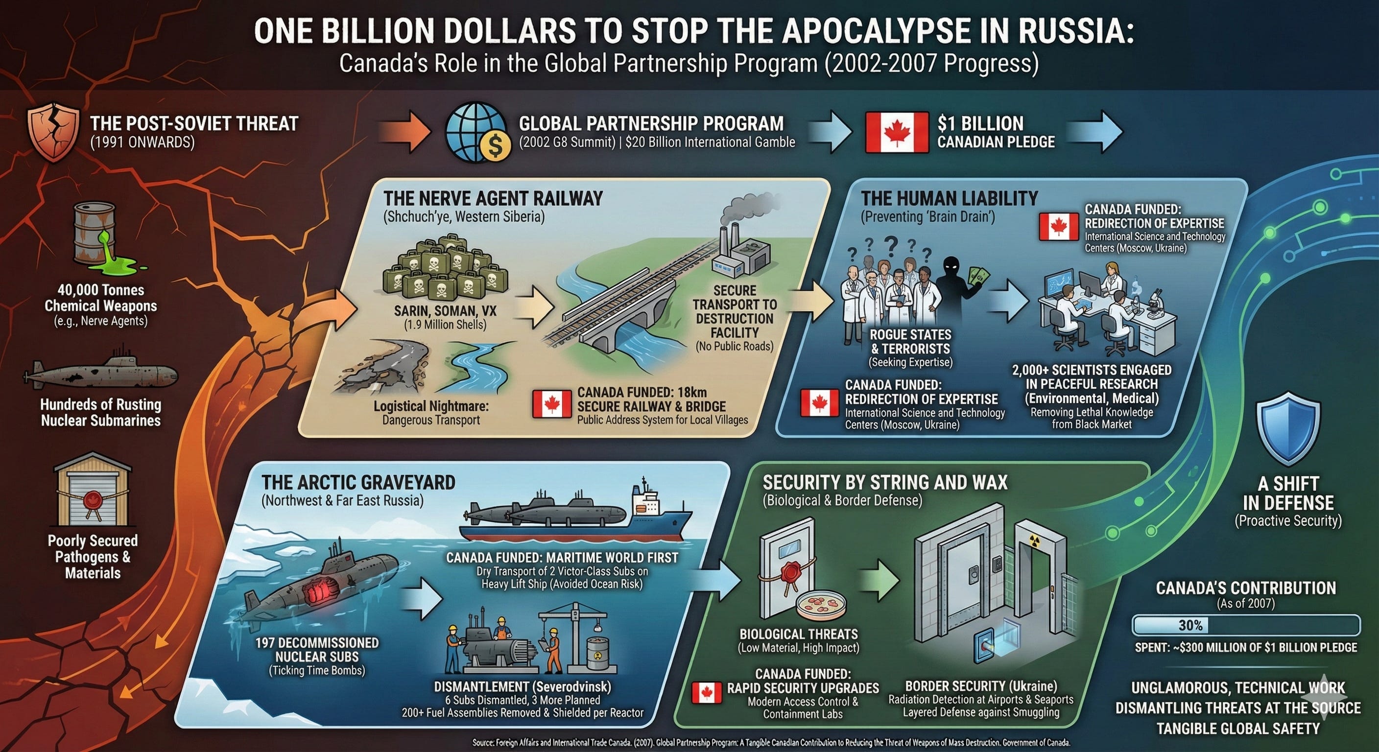 The dissolution of the Soviet Union in 1991 did not just end a geopolitical era. It cracked open a Pandora’s box of lethal materials that had been stockpiled for decades. As the Iron Curtain fell, it revealed a terrifying landscape of unguarded threats: forty thousand tonnes of chemical weapons, hundreds of rusting nuclear submarines, and warehouses full of pathogens secured by little more than wax seals. This was the chaotic reality that birthed the Global Partnership Program. Launched at the G8 Kananaskis Summit in 2002, this initiative represented a twenty billion dollar international gamble to secure these materials before they could be sold to the highest bidder or seized by terrorist groups. Canada stepped into this volatile vacuum with a pledge of one billion dollars, initiating a race against time to dismantle the physical legacy of the Cold War before it could be weaponized against the West.