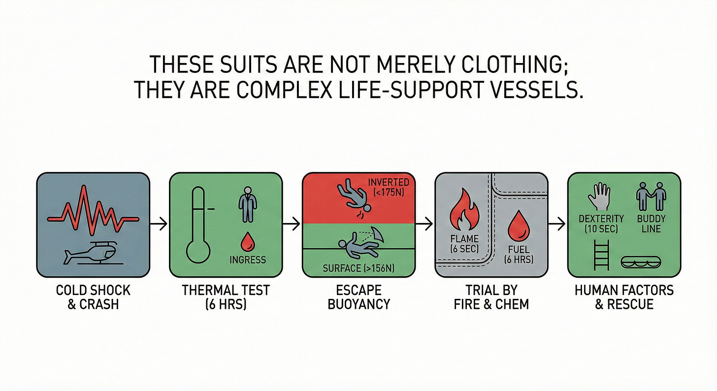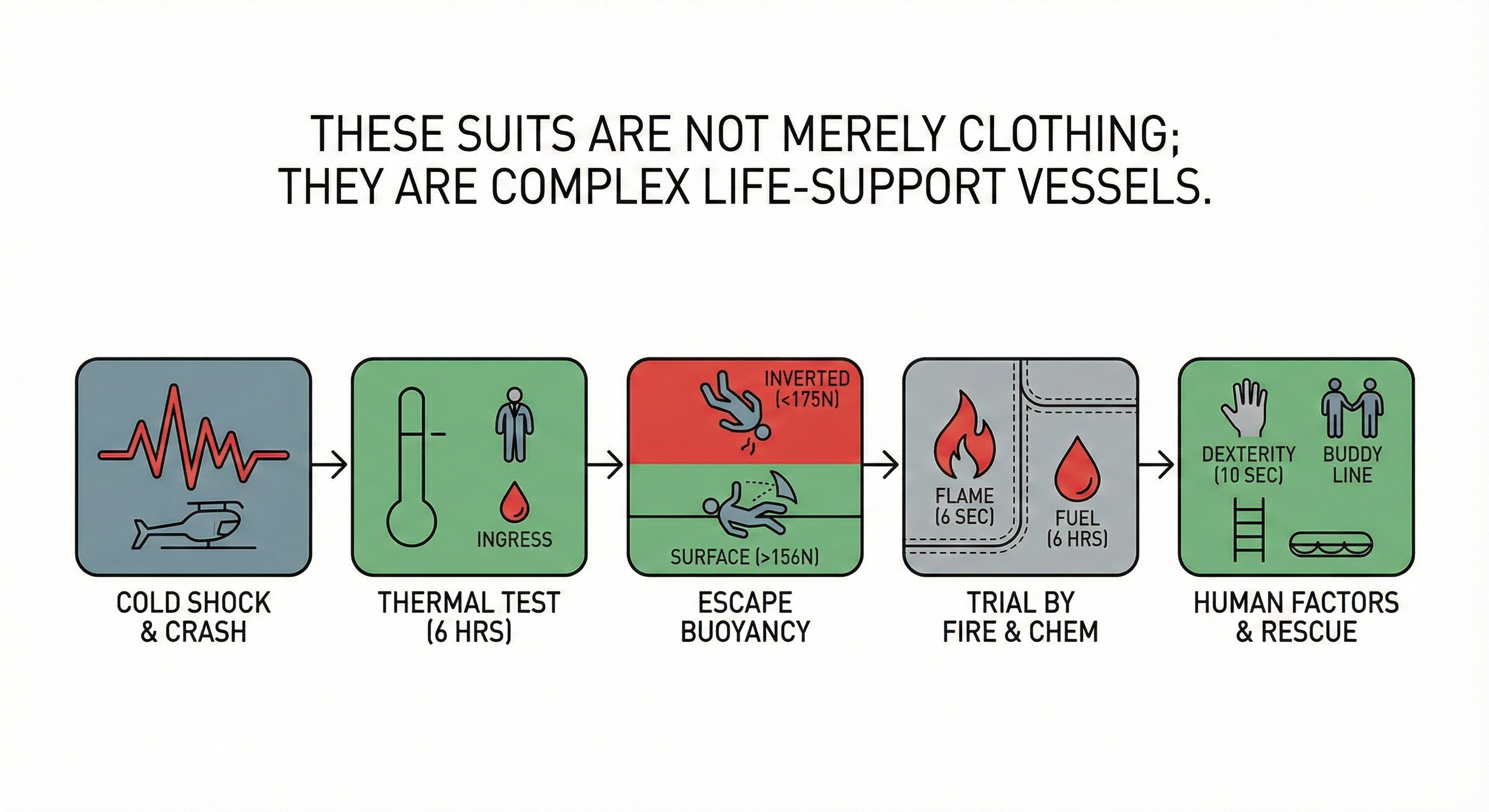 The standard defines the thin line between a recoverable survivor and a casualty. It assumes that help will come, but not immediately. It assumes the water will be near freezing. It assumes the helicopter may be upside down. Every stitch, seal, and valve in these suits is subjected to a battery of tests designed to replicate the violence of a crash and the slow, creeping lethality of the North Atlantic.