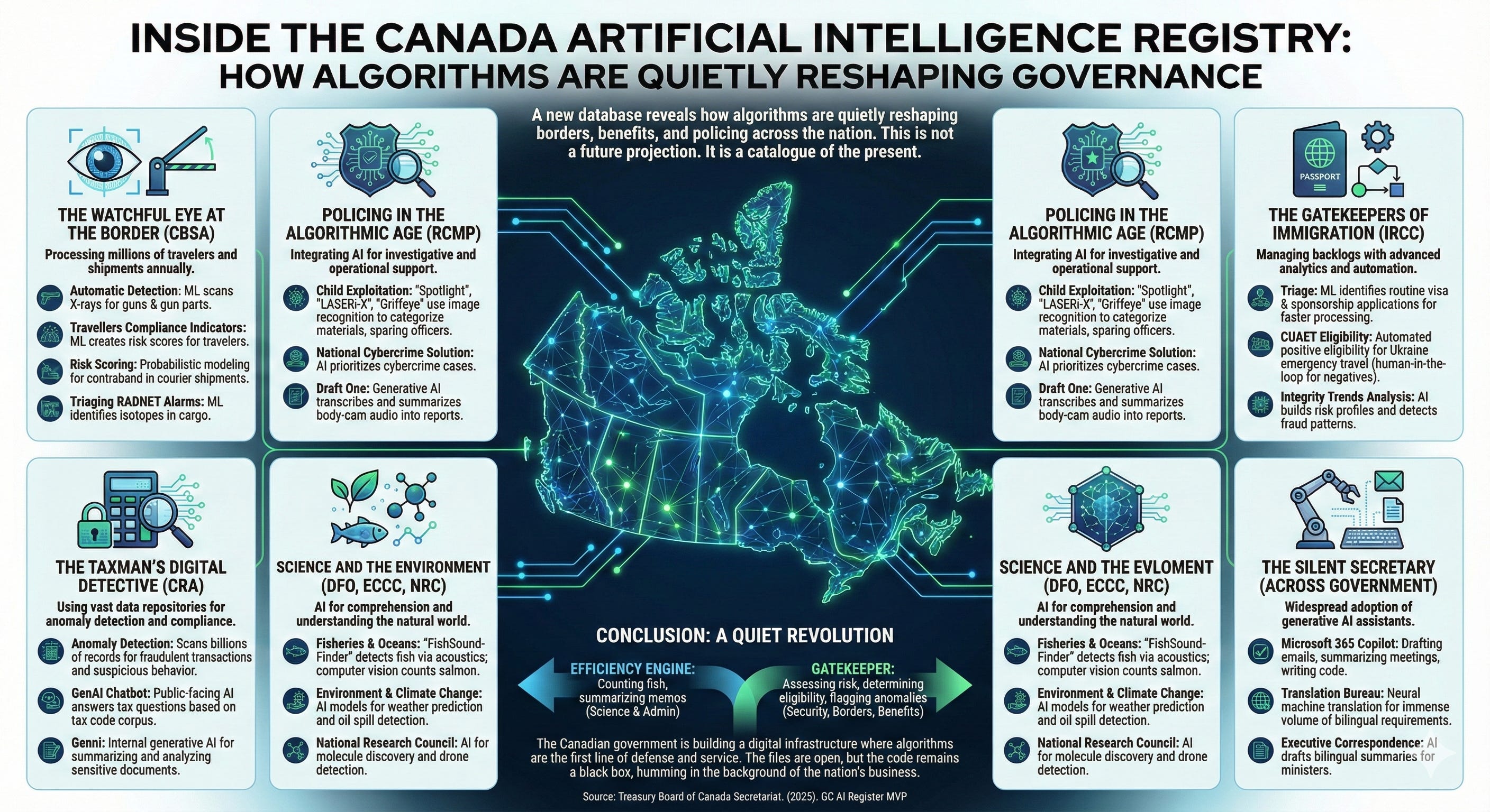 The modernization of the state is rarely a loud affair. It happens in server rooms and software updates, far removed from the marble halls where laws are debated. Yet a newly released dataset, the Canada Artificial Intelligence Registry, offers a rare glimpse into the digital nervous system now operating beneath the surface of the federal government. This is not a future projection. It is a catalogue of the present. Across dozens of departments, from the border to the tax office, artificial intelligence is no longer an experiment. It has become an active participant in the governance of the nation.