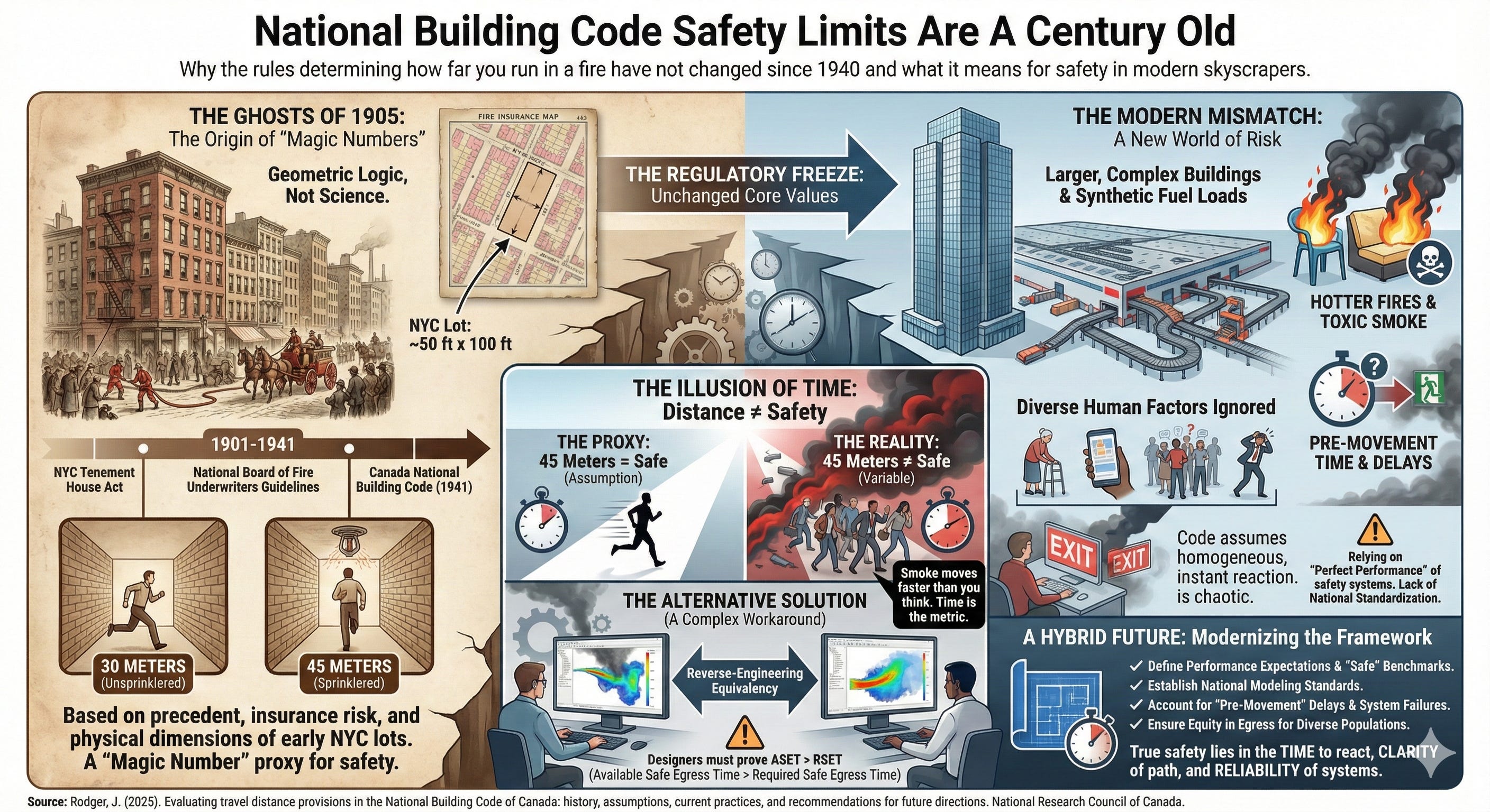 A comprehensive report commissioned under the National Research Council of Canada reveals a startling reality. The foundational travel distance limits in the National Building Code are not based on modern empirical modeling. They are ghosts of the early twentieth century, based on precedent, insurance guidelines from 1905, and the physical dimensions of New York City lots from a time when skyscrapers were a novelty. As buildings have grown larger, more complex, and filled with synthetic materials that burn hotter and faster, the regulatory numbers governing our escape have remained virtually frozen in time.