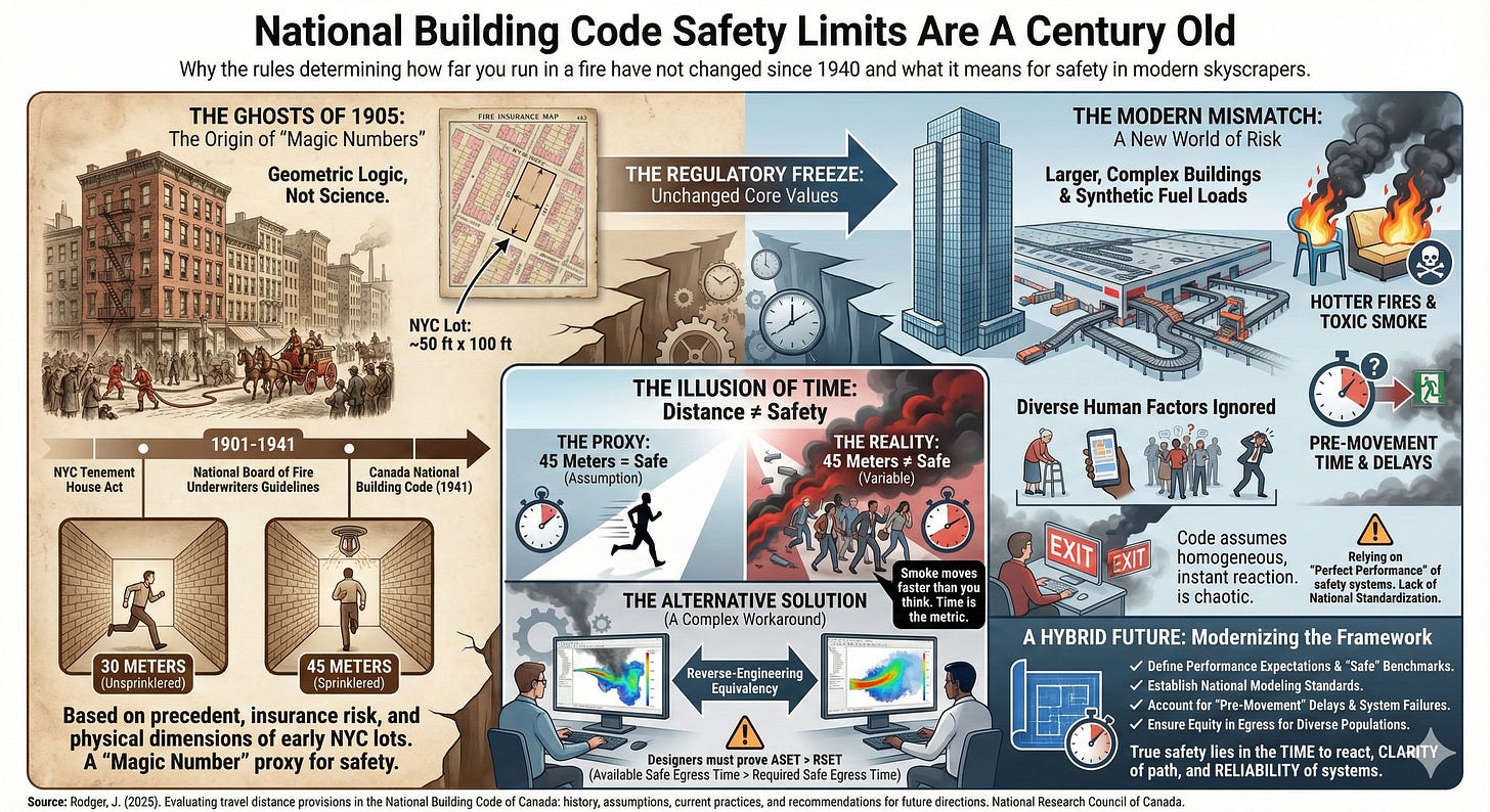Over eighty years later, the core values remain largely unchanged. The current National Building Code prescribes a maximum travel distance of 45 meters in sprinklered floor areas and 30 meters in unsprinklered ones. While minor adjustments have been made for open-air garages or specific corridors, the baseline assumption persists: if you are within 45 meters of an exit, you are safe. The report describes these as “magic numbers,” metrics that convey a sense of precise engineering safety while concealing the fact that they originate from administrative convenience rather than data on human survival.