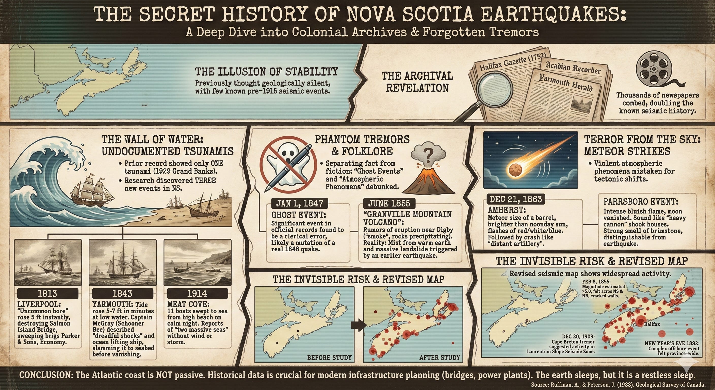 The value of this historical detective work lies in the revised picture of risk it presents. Before this study, the seismic map of Nova Scotia was largely blank, save for a few anecdotal reports. Now, the map is dotted with epicenters. The researchers documented felt reports from Halifax to Sydney, from Yarmouth to the Annapolis Valley.