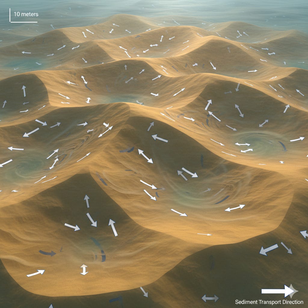 While some parts of the shelf are frozen in time, others are incredibly dynamic. On the shallow banks, where strong currents and storm waves affect the seabed, coarse-grained sands and gravels are in constant motion. This sediment transport creates massive underwater features called bedforms.