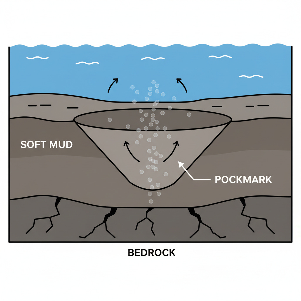 In the deep, muddy basins of the Scotian Shelf, the seabed is dotted with thousands of cone-shaped depressions called pockmarks. These features form when gas, likely originating from hydrocarbon deposits in the bedrock below, vents up through the cohesive mud. The basins contain the densest distributions of pockmarks on the entire Scotian Shelf, with an estimated 200 pockmarks per square kilometre in Roseway Basin.