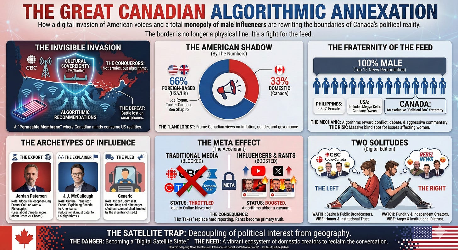 How a digital invasion of American voices and a total monopoly of male influencers are rewriting the boundaries of Canada’s political reality.