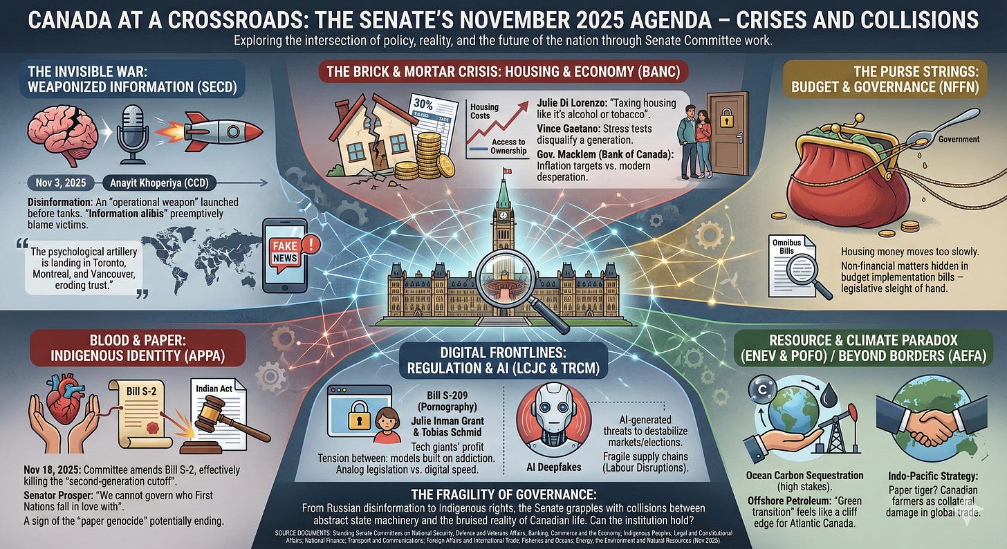 From the existential threat of Russian information warfare to the intimate definition of Indigenous identity, the Senate’s work in November 2025 reveals a nation at a crossroads.