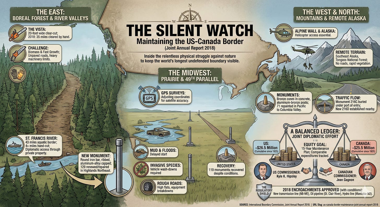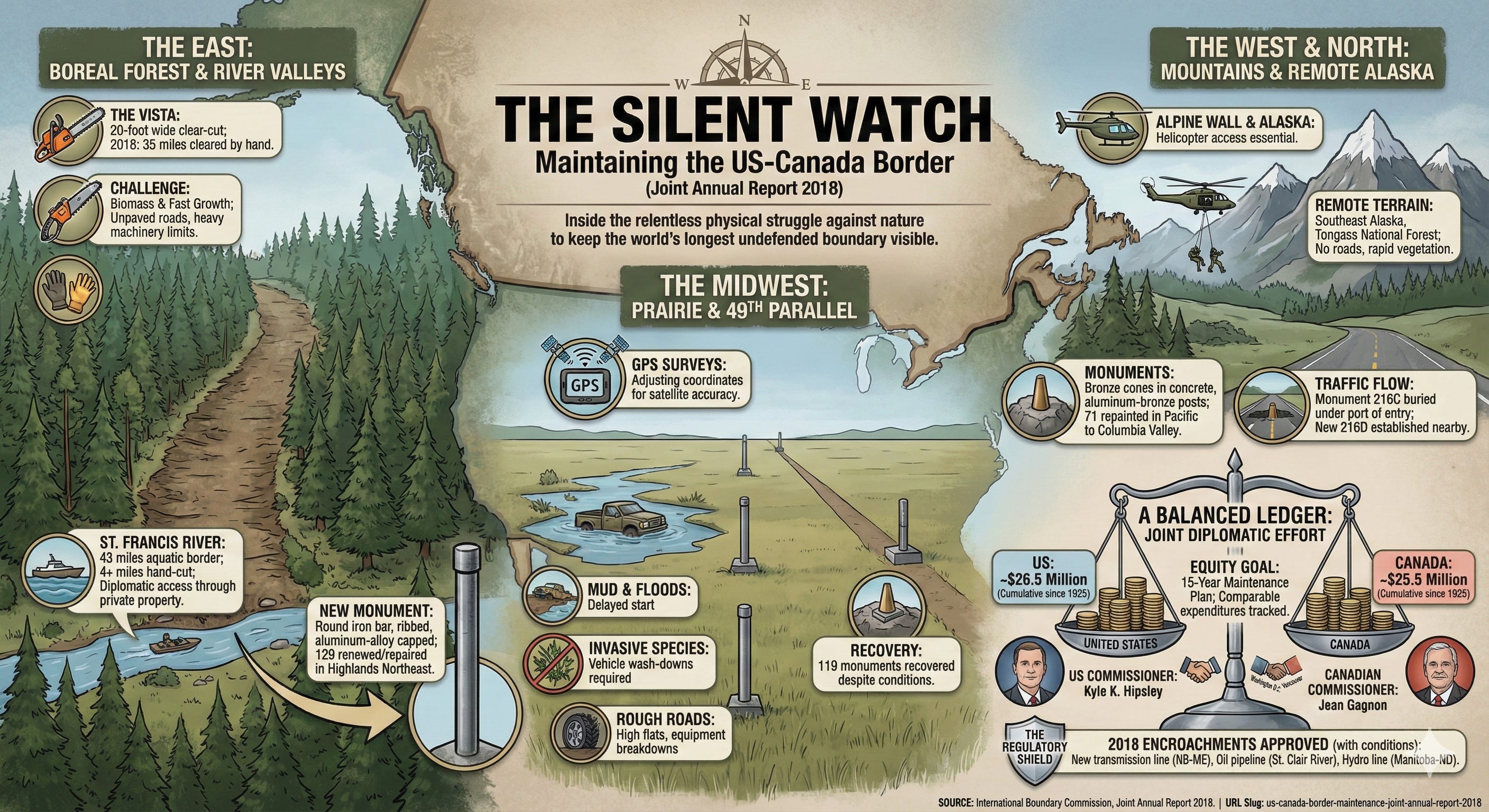 The Commissioners, Kyle K. Hipsley for the United States and Jean Gagnon for Canada, met twice in 2018. They met once in Washington, D.C., and once in Vancouver. Their role is to oversee the abstractions of the budget and the realities of the field. They conducted inspections personally, traveling to the West Line to look at line houses and rivers, and visiting the field parties on the 49th Parallel. They stood at Monument 178, where the St. Francis River meets the Southwest Line, witnessing the physical convergence of the abstract lines they are sworn to uphold.