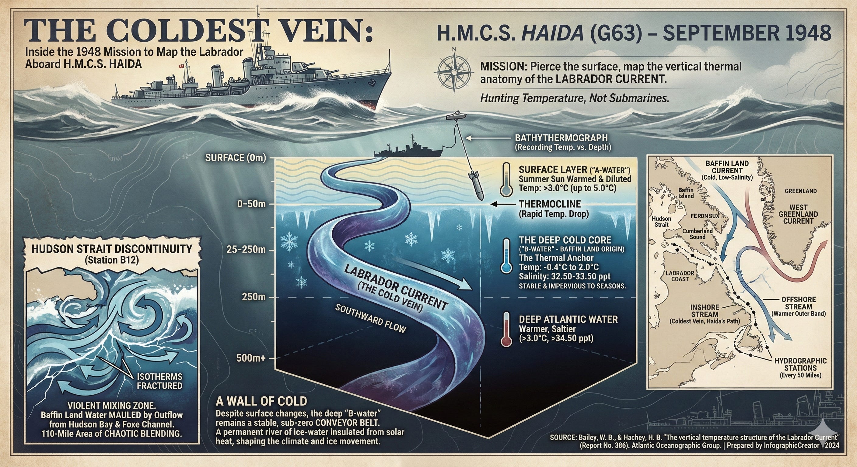 Inside the 1948 mission to map the invisible thermal architecture of the Labrador Current aboard H.M.C.S. Haida.