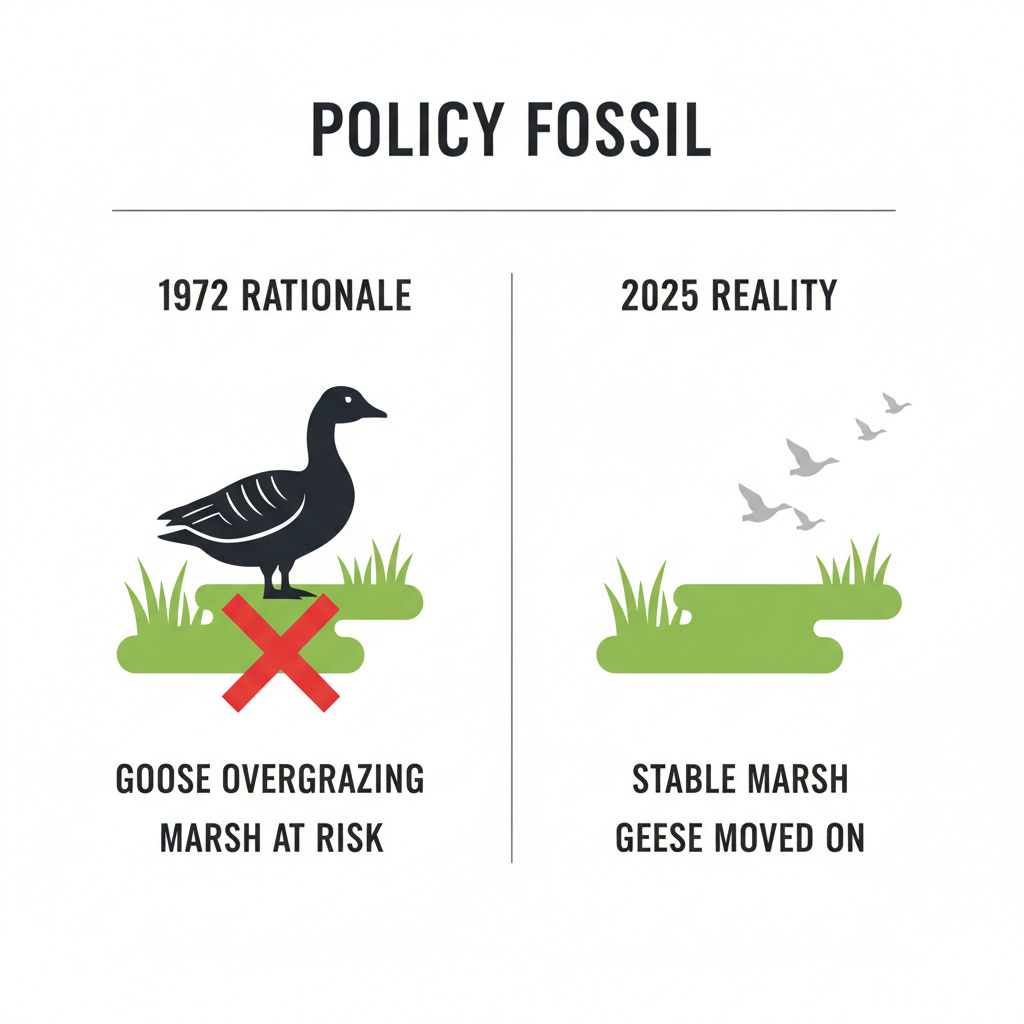 To understand this situation, we need a better analogy than “red tape.” Think instead of a Policy Fossil. A fossil is the imprint of a once-living thing, preserved in stone long after its environment has changed. A Policy Fossil is a rule or program which has outlived its original purpose. The rule remains on the books, a relic of a past reality, shaping present-day actions for reasons which are no longer valid. The controlled hunt and entrance fees at Cap Tourmente are perfect examples of Policy Fossils. They were created to solve specific problems of their time. The evidence now shows those problems no longer exist. The work of good governance is to recognize these fossils and thoughtfully remove them.